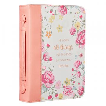 Des fleurs corail et pastel avec le verset de Romains 8:28