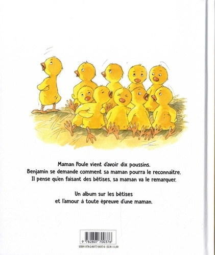 Maman Poule vient d'avoir dix poussins. Tous se ressemblent, ils sont petits et jaunes. Benjamin se demande comment sa maman pourra le reconnaître. Il pense qu'en faisant des bêtises, sa maman va le remarquer.