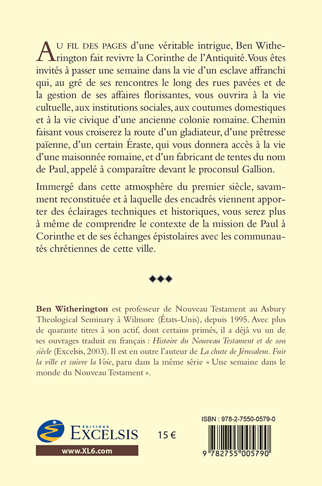 Au fil des pages d’une véritable intrigue, Ben Witherington fait revivre la Corinthe de l’Antiquité. Vous êtes invités à passer une semaine dans la vie d’un esclave affranchi qui, au gré de ses rencontres le long des rues pavées et de la gestion de ses affaires florissantes, vous ouvrira à la vie cultuelle, aux institutions sociales, aux coutumes domestiques et à la vie civique d’une ancienne colonie romaine. Chemin faisant vous croiserez la route d’un gladiateur, d’une prêtresse païenne, d’un certain Éraste, qui vous donnera accès à la vie d’une maisonnée romaine, et d’un fabricant de tentes du nom de Paul, appelé à comparaître devant le proconsul Gallion.