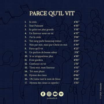 L’album « Parce qu’il vit » nous permet de découvrir plusieurs chants anglophones récents traduits avec beaucoup de soin : « Je crois » et « Hymne des Cieux » de Phil Wickham, « Il me gardera », « Tiens-moi, mon Sauveur » et « Je ne m’appartiens plus » de Getty Music et divers auteurs associés dont Skye Peterson. S’y ajoute aussi « Sa grâce est plus grande » de Matt Botswell et Matt Papa. Psalmodie reprend aussi une composition originale de Foksason « Un parfum de bonne odeur » et deux chants d’Écriture « Un Sauveur nous est né » et « Par la croix ». Dans tous les titres une constante ; des paroles ancrées dans les Écritures qui rappellent le message de mort et la résurrection de Jésus-Christ, les promesses de Dieu et distillent des encouragements pour la marche chrétienne.