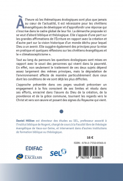 À l’heure où les thématiques écologiques sont plus que jamais au coeur de l’actualité, il est nécessaire pour les chrétiens évangéliques de développer et d’approfondir une réponse qui s’inscrive dans le cadre global de leur foi. La démarche proposée ici se veut d’abord biblique et théologique. Elle suggère également des principes pour la mise en pratique et quelques réflexions sur les chrétiens évangéliques et le « climatoscepticisme ».