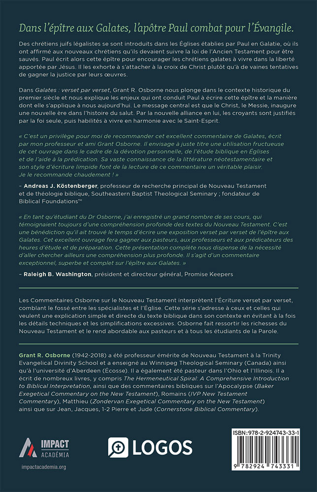 Dans *Galates : verset par verset*, Grant R. Osborne nous plonge dans le contexte historique du premier siècle et nous explique les enjeux qui ont conduit Paul à écrire cette épître et la manière dont elle s’applique à nous aujourd’hui. Le message central est que le Christ, le Messie, inaugure une nouvelle ère dans l’histoire du salut. Par la nouvelle alliance en lui, les croyants sont justifiés par la foi seule, puis habilités à vivre en harmonie avec le Saint-Esprit.
