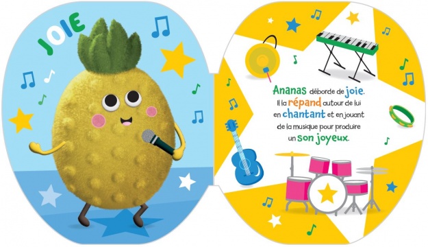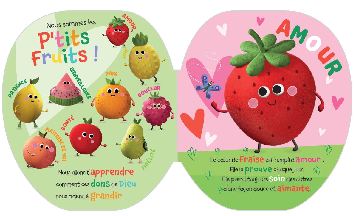 L’amour, la joie, la paix, la gentillesse, la bienveillance, la bonté, la fidélité, la douceur et la maîtrise de soi, sont ici représentés sous la forme de véritables fruits : la fraise – héroïne de ce livre – mais aussi, l’ananas, l’orange, le citron, la pastèque, la pomme, la poire, la framboise et la pêche.