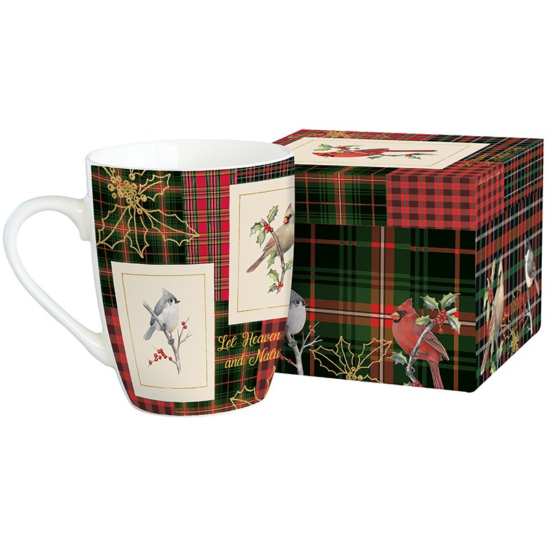 Motif écossais de Noël avec cardinaux et détails de houx.