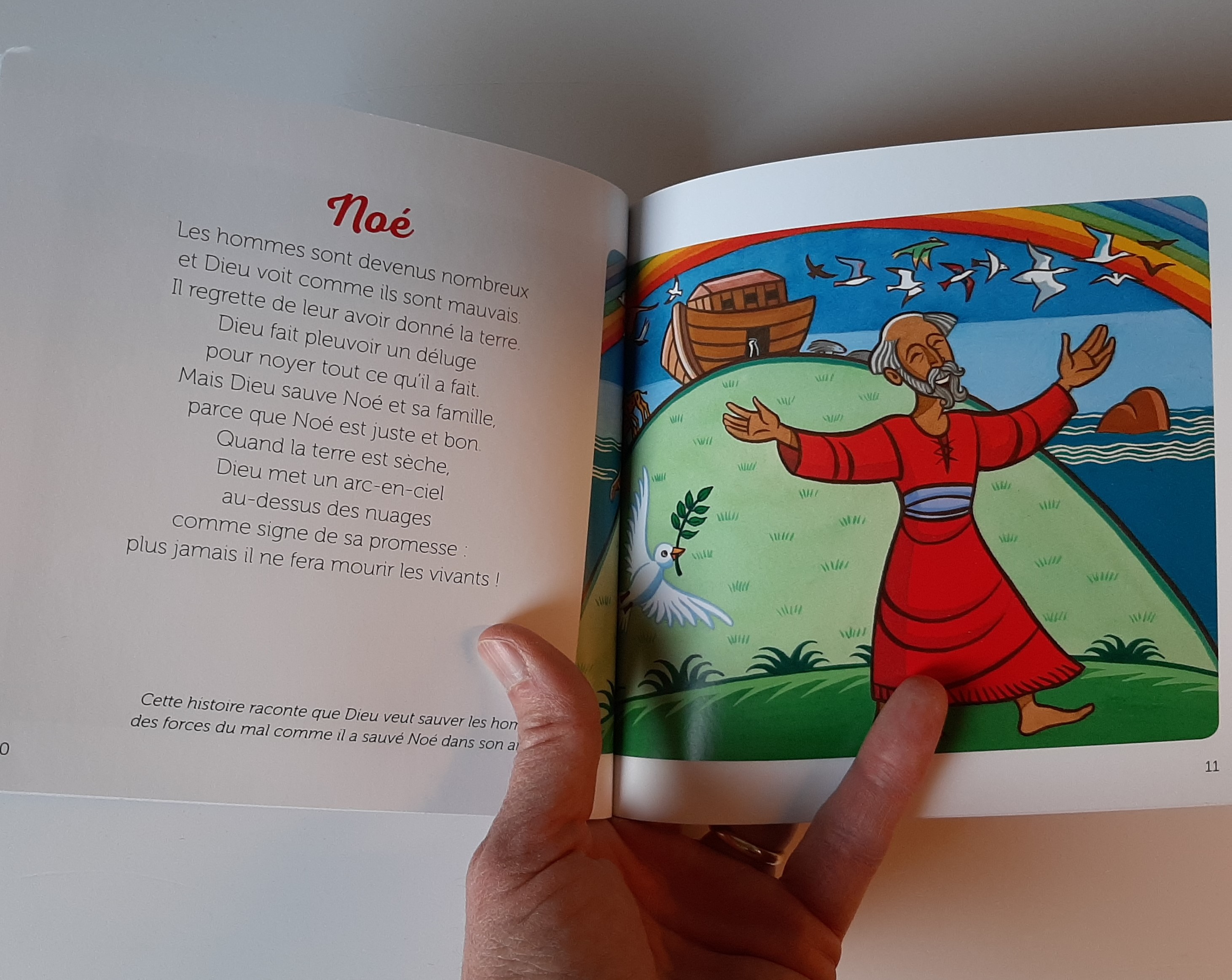 Adam et Eve, Cain et Abel, Noé, Abraham... on entre dans les récits de la Bible par le biais de ses principaux personnages. Le texte brosse en quelques phrases ces différentes figures bibliques. Chaque dessin vient compléter ce texte en mettant en relief un épisode de la vie des personnages.