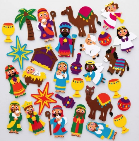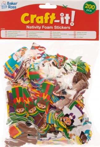 200 autocollants avec 25 modèles différents représentant la crèche, les anges, les bergers, les rois mages, les animaux et l’étoile de Bethléem etc.