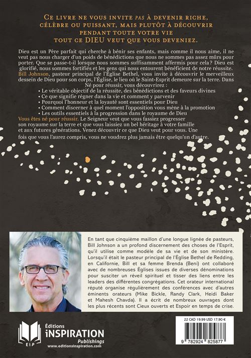 Beaucoup ont tenté de trouver leur importance dans ce qu’ils font et non dans qui ils sont. À cause de cela, ils basent leur identité sur leurs performances, ce qui les incite à chercher à en faire toujours plus. À moins que cette tendance n’ait été étouffée, nous avons tous un désir inné d’avoir de l’importance et du succès. Ces deux désirs sont étroitement liés et nous aspirons à mener une vie qui compte. Mais pour ce faire, nous devons réaliser que notre importance dépend de qui nous sommes (notre identité) alors que notre succès résulte de ce que nous faisons (notre objectif). Ce nouveau livre de Bill Johnson est un merveilleux ouvrage qui aborde des sujets épineux : la faveur de Dieu et des hommes, le règne dans la vie, la réussite et la bénédiction.