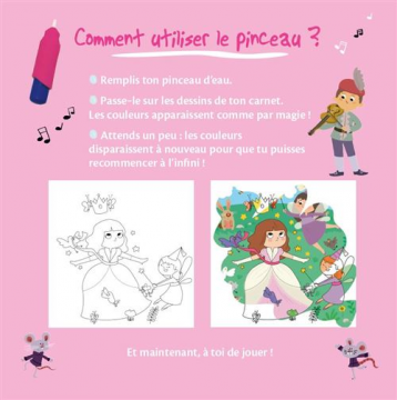 Peins avec de l'eau, et regarde des scènes de contes de fées apparaître en couleurs ! C'est magique ! Il te suffit de remplir ton pinceau avec de l'eau, puis de le passer sur les 6 décors magiques de ton carnet pour voir apparaître des princesses et des fées en couleurs. Attends un peu : les couleurs disparaissent à nouveau pour que tu puisses recommencer à l'infini ! Grâce au pinceau magique, tu vas découvrir une nouvelle manière de peindre à l'eau sans te tacher !