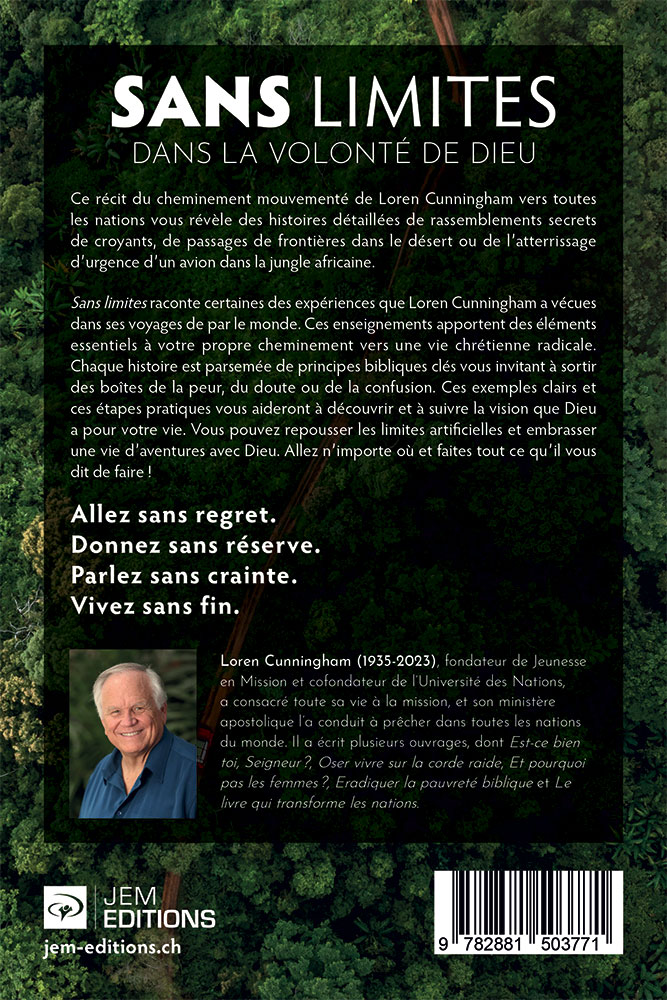 Sans limites raconte certaines des expériences que Loren Cunningham a vécues dans ses voyages de par le monde. Ces enseignements apportent des éléments essentiels à votre propre cheminement vers une vie chrétienne radicale. Chaque histoire est parsemée de principes bibliques clés vous invitant à sortir des boites de la peur, du doute ou de la confusion. Ces exemples clairs et ces étapes pratiques vous aideront à découvrir et à suivre la vision que Dieu a pour votre vie. Vous pouvez repousser les limites artificielles et embrasser une vie d'aventures avec Dieu. Allez n'importe où et faites tout ce qu'il vous dit de faire !