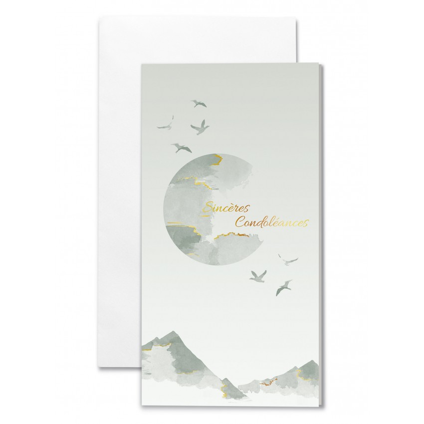 Carte double "Sincères Condoléances", Oiseaux dans le ciel et Lune au-dessus de montagnes.