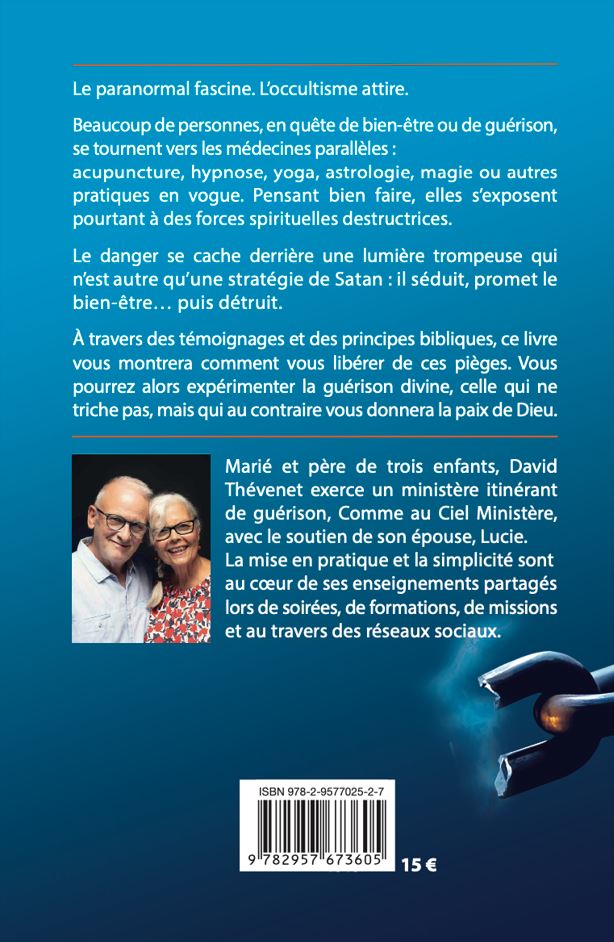 À travers des témoignages et des principes bibliques, ce livre vous montrera comment vous libérer de ces pièges. Vous pourrez alors expérimenter la guérison divine, celle qui ne triche pas, mais qui au contraire vous donnera la paix de Dieu.