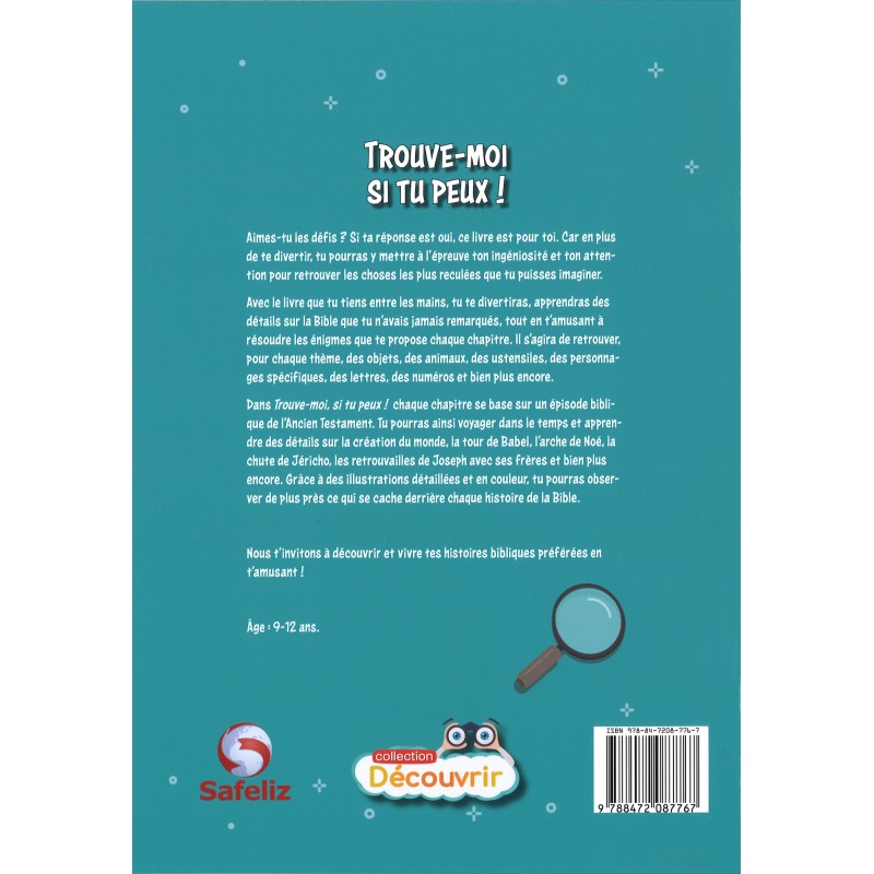 Avec le livre, tu te divertiras, apprendras des détails sur la Bible que tu n'avais jamais remarqués, tout en t'amusant à résoudre les énigmes que te propose chaque chapitre. Il s'agira de retrouver, pour chaque thème, des objets, des animaux, des ustensiles, des personnages spécifiques, des lettres, des numéros et bien plus encore.
