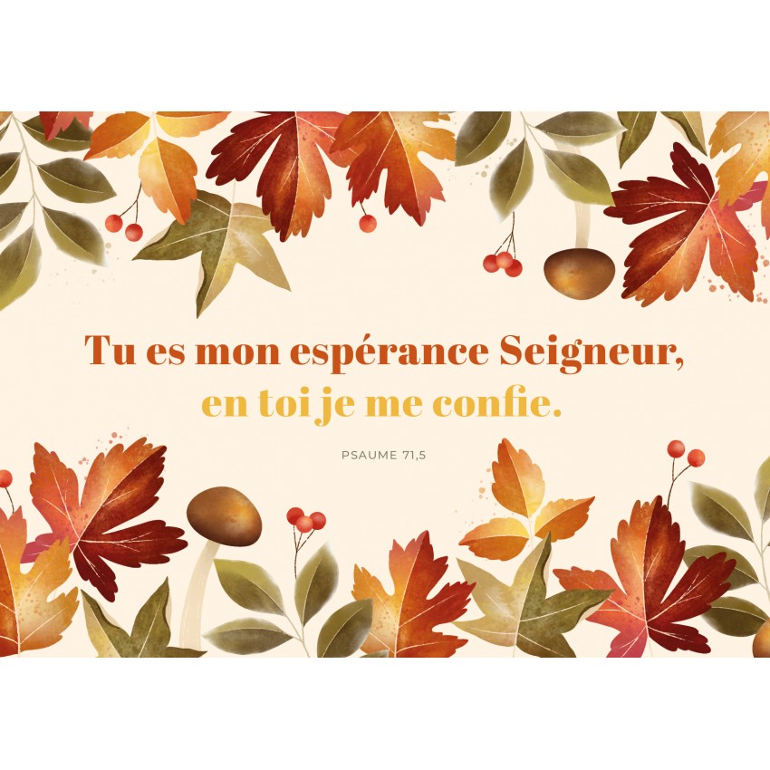 Jolie carte "Fleurs d'automne et champignons" avec le verset Tu es mon espérance Seigneur, en toi je me confie. (Psaume 71,5)